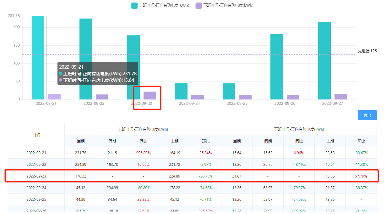 找到異常點(diǎn)??梢酝ㄟ^柱狀圖和圖表,發(fā)現(xiàn)9月23日的下班時(shí)間能耗要大于一周的平均能耗: