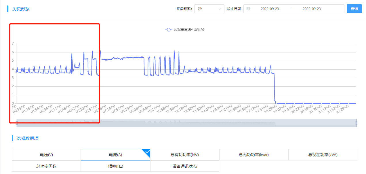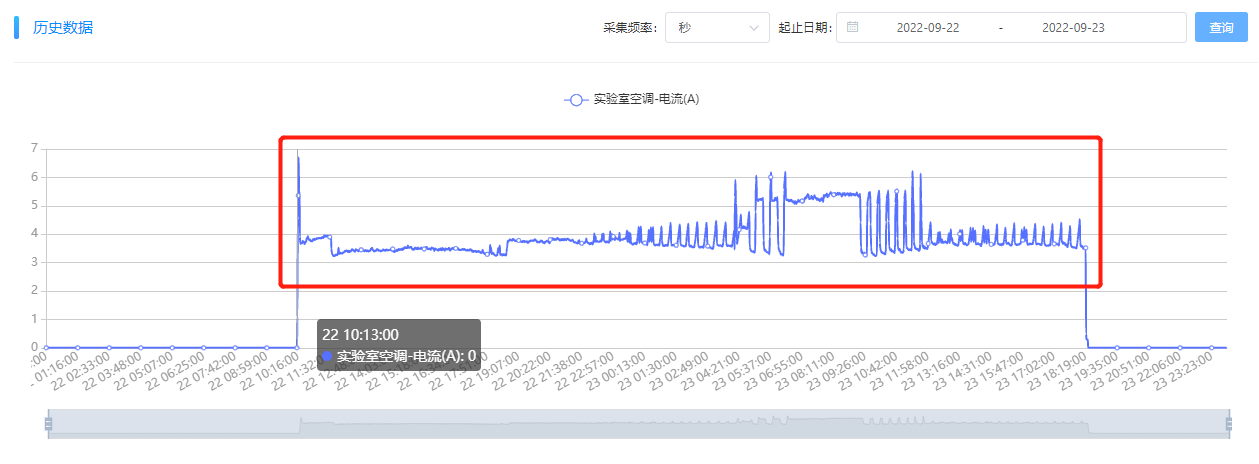 異常用能確認(rèn)。根據(jù)“能源監(jiān)控—歷史數(shù)據(jù)分析”來進(jìn)一步確認(rèn)異常點(diǎn)的異常數(shù)據(jù),9月23日的用能異常確實(shí)是“嵌入式組-實(shí)驗(yàn)室-空調(diào)”設(shè)備未關(guān)機(jī)造成的。拉取9月22日至9月23日數(shù)據(jù),發(fā)現(xiàn),該嵌入式研發(fā)實(shí)驗(yàn)室的空調(diào)在9月22日上午10點(diǎn)開機(jī)后,至次日9月23日下午17點(diǎn)35分左右關(guān)機(jī),9月22日未關(guān)機(jī)。
