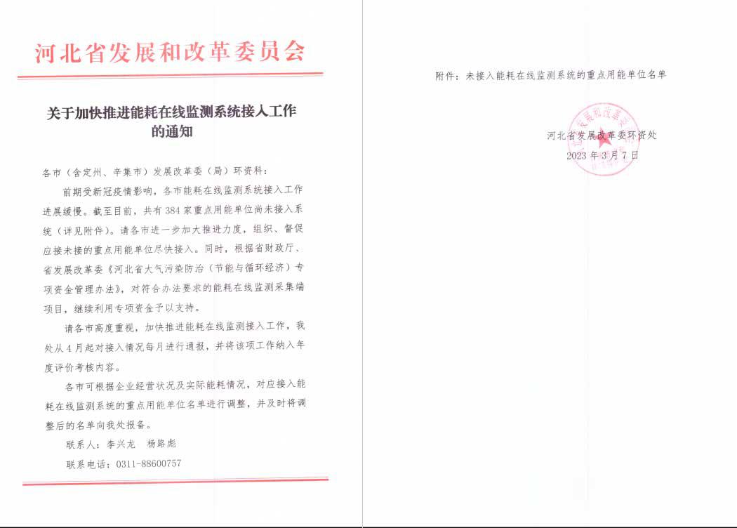 日前,河北省發(fā)改革委會下發(fā)紅頭文件,要求未接入能耗在線監(jiān)測系統(tǒng)的重點用能單位請盡快接入,具體文件內(nèi)容如下: