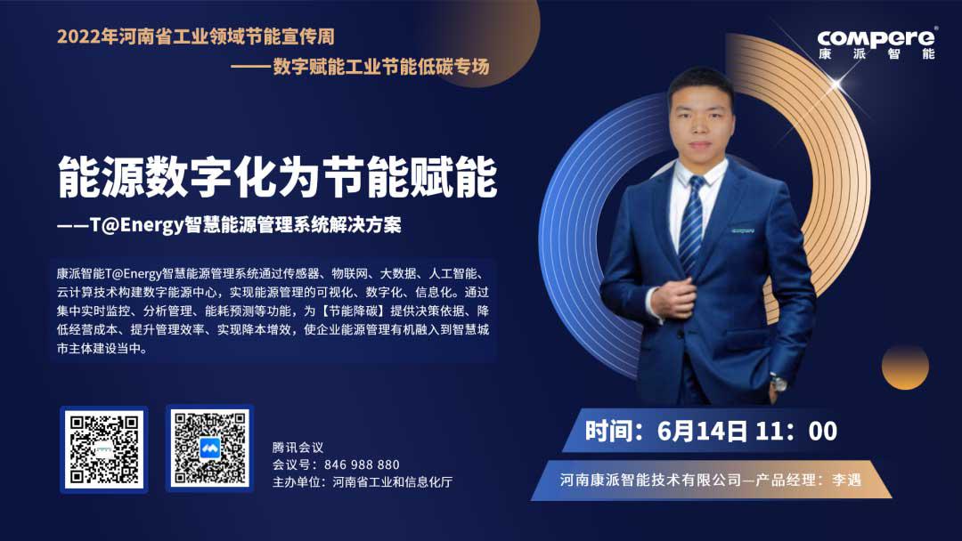 2022年6月,響應(yīng)國家發(fā)改委與河南省工信廳“節(jié)能宣傳周”活動要求,康派智能積極響應(yīng),主動配合完成數(shù)字賦能工業(yè)節(jié)能低碳專場活動,以線上宣傳的方式,向社會及工業(yè)企業(yè)完成主題為《能源數(shù)字化為節(jié)能賦能--T@Energy智慧能源管理系統(tǒng)解決方案》的宣講活動。