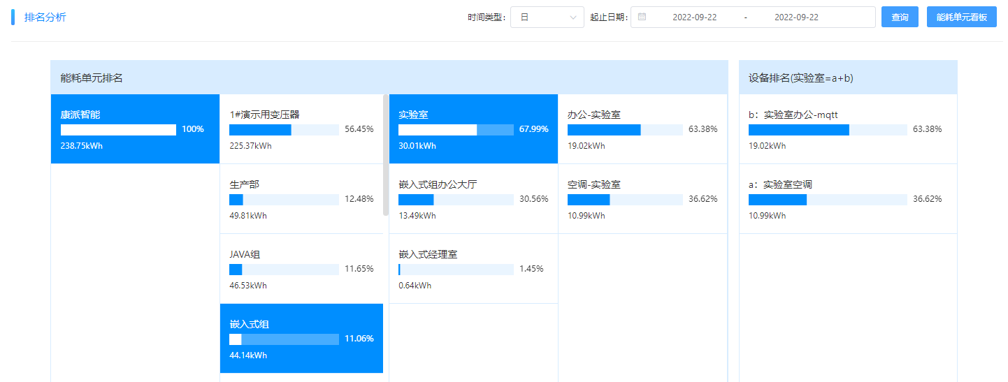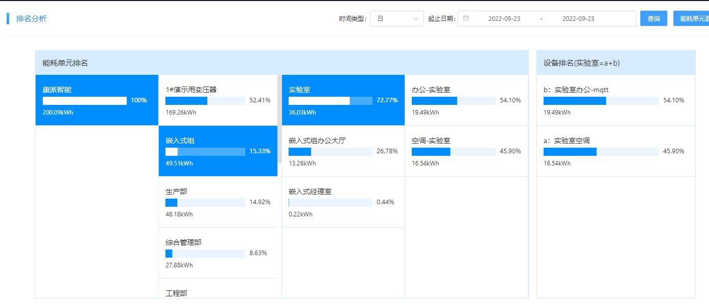 沿途索驥。通過前后兩天的能耗排名變化,確定異常用能部門。嵌入式組的用電排名,22號在第4位,23號升到第二位,多出了5kWh左右。通過對嵌入式組下一級的能耗對比發(fā)現(xiàn)為實(shí)驗(yàn)室用能比前一天多了6kWh左右,再進(jìn)一步對實(shí)驗(yàn)室的下一級能耗分析,發(fā)現(xiàn)為實(shí)驗(yàn)室空調(diào)比前一日多了6kWh。可以初步確認(rèn)是實(shí)驗(yàn)室的空調(diào)在非工作時(shí)間沒有關(guān)機(jī)。